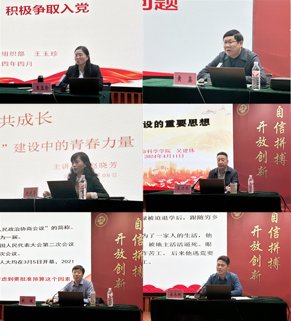 在集中授课环节,培训班先后邀请到校党委组织部副部长王玉珍、校党委统战部副部长黄鑫、校党委宣传部副部长赵晓芳、学院党委书记吴建伟、河南省教育系统理论宣讲专家/马克思主义学院教授欧健、学院党委副书记宋永鹏分别就《严格标准程序,积极争取入党》《大学生应该怎样正确认识和对待民族宗教问题》《我与母校共成长——“双一流”“双航母”建设中的青春力量》《习近平总书记关于党的建设的重要思想》《深入学习2024全国两会精神》《学习焦裕禄精神》等内容为学员进行了培训。