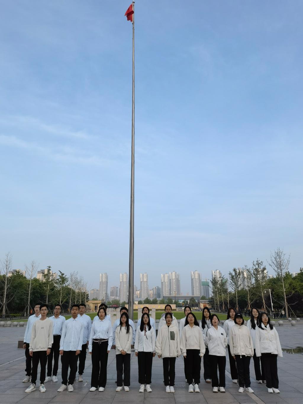 曙光熹微,万籁俱寂,远处东方地平线泛起一丝亮光,浸润着雾蓝的天空。同学们早早地来到明德广场,按班级排列在国旗前整齐地站好队伍。6时30分,升旗仪式正式开始,国旗护卫队的同学迈着矫健整齐的步伐,护送鲜艳的五星红旗向国旗台走来,伴随着慷慨激昂的中华人民共和国国歌《义勇军进行曲》,台下全体师生庄严地向国旗行注目礼,向伟大的中华人民共和国致敬,鲜艳的五星红旗也冉冉升起,在风中激扬飘荡。