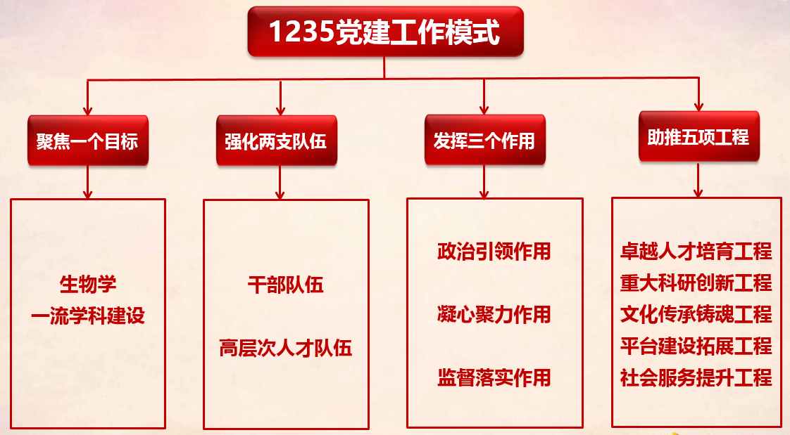 “1235”党建工作模式中的“1”,即聚焦“生物学一流学科建设”这一终极目标,在学科发展中发挥党委的引领和保驾护航作用,为学科发展注入无限活力。