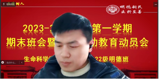 此次期末班会暨寒假劳动教育动员会对同学们在寒假期间的学习和实践做出了具体要求。2022级明德班成立以来,同学们努力学习、积极参与科研,取得了令人满意的成绩。在今后的学习过程中,明德班全体同学将继续发扬优良传统,不断提升学习的效率和效能,拓展学习的视野和疆界,通过研究型学习不断提升自己,成长为复合创新型人才。