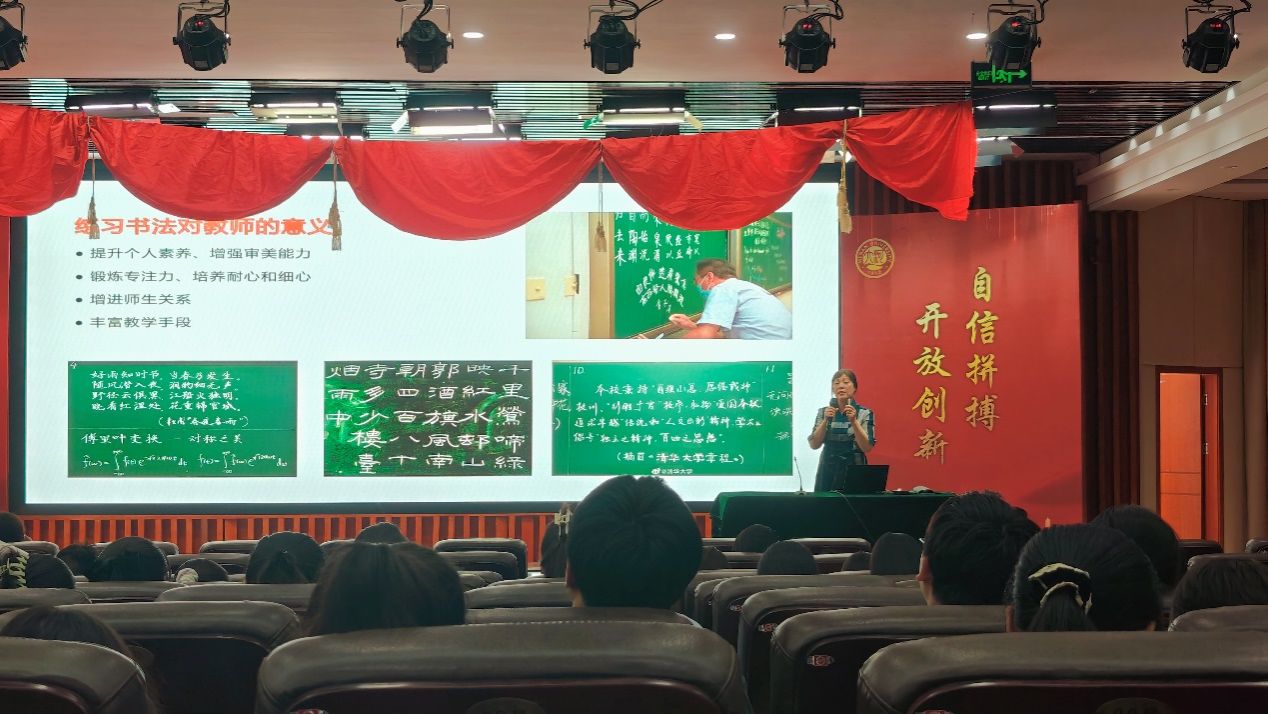 生物科学系副主任肖保林介绍了近年来相关师范专业教育技能比赛的规则和取得的优异成绩。河南省优秀教师、中原名师谷艳芳教授以“书法学习的心路”为题开展了讲座。她分享了自己习练书法的历程、心得和收获,深入探讨了书法对于教师教育教学工作的意义,引发了与会师生的广泛共鸣。