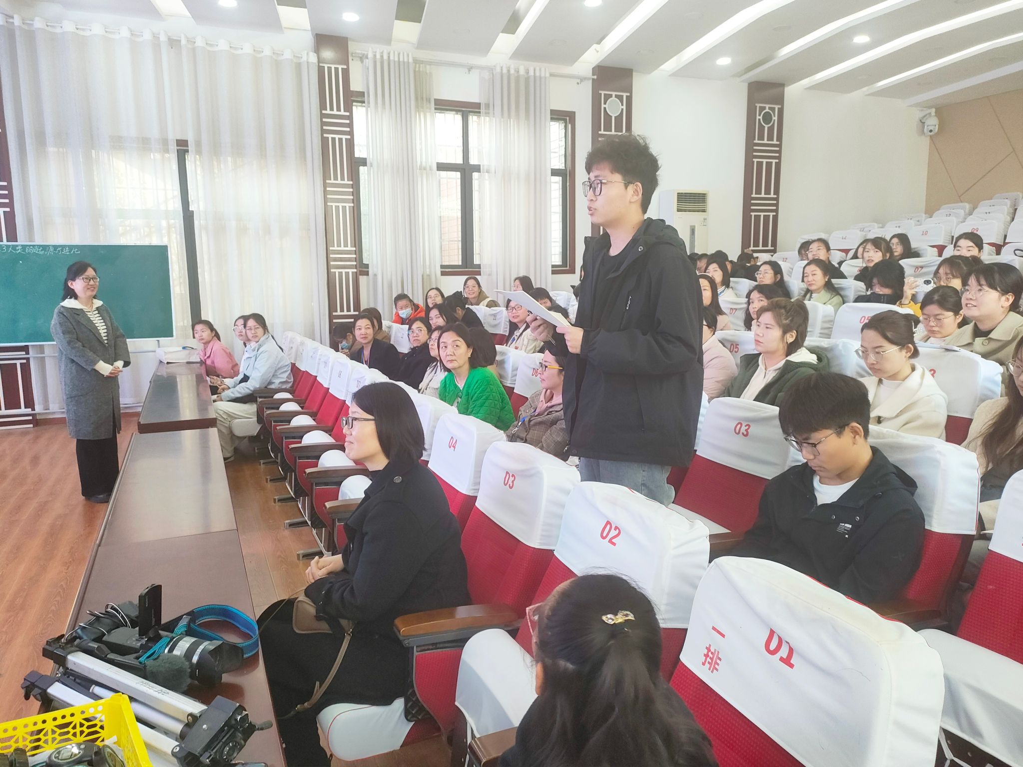 李志芳代表学院对参与此次教研交流指导活动的省级骨干老师表示欢迎,鼓励教育硕士以一线优秀教师为榜样和目标,努力提升自身教学水平和教师综合素养。在业务交流环节,刘咏琴、马彬彬、史永春三名同学分别进行教学展示,骨干教师对同学们的表现给予了高度评价,同时也对教育硕士的教学设计、教姿教态、板书设计等提出了宝贵的意见和建议。活动现场精彩瞬间不断,教育硕士研究生与一线骨干教师深入互动,纷纷表示要通过不断学习,不断探索,不断实践,知难而进,促进教师专业化成长。