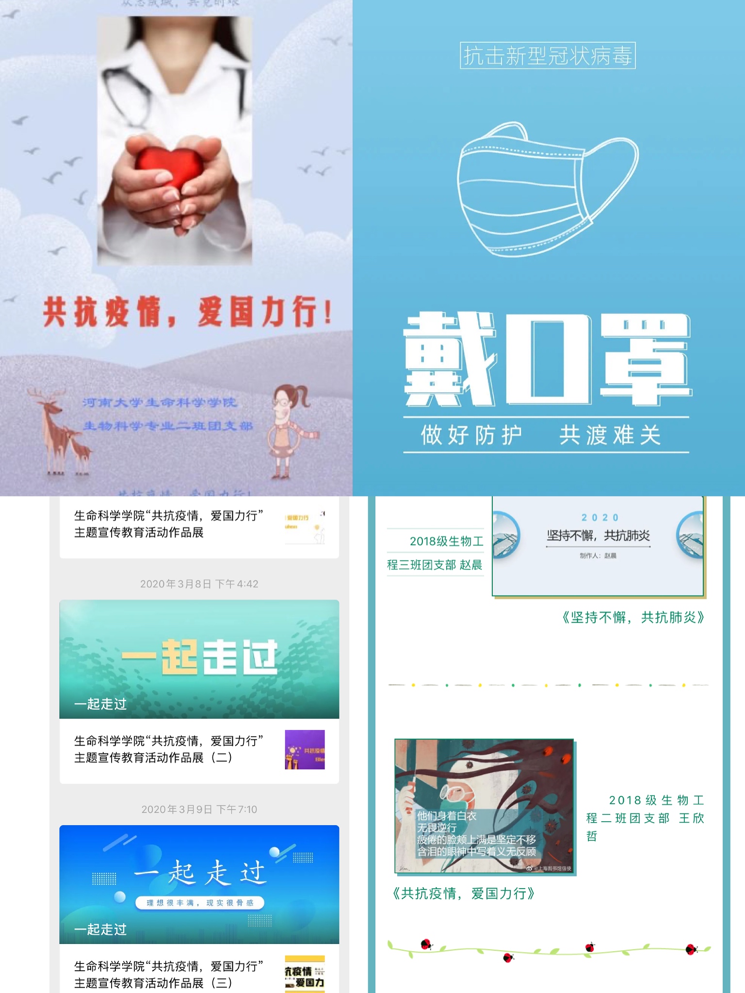 各团支部结合实际,坚持团结向上、积极正面的导向,结合学院学科特色,组织团员创作青年学生喜闻乐见、内容健康、形式多样的线上文创作品(海报、短视频、PPT等),选取优秀作品,通过学院微信公众号平台进行展示,充实团员青年精神文化生活,引导团员青年正确认识疫情,讴歌主旋律,凝聚正能量。