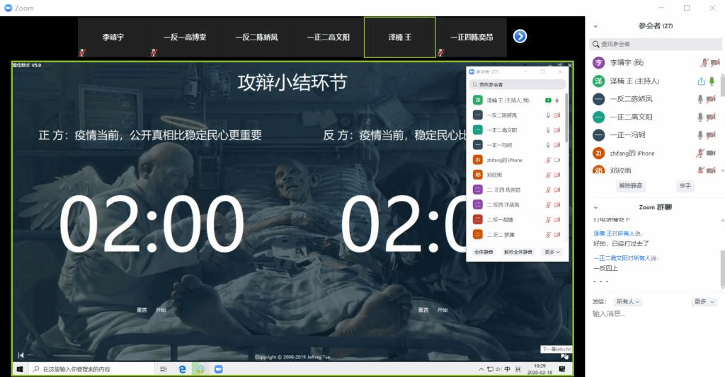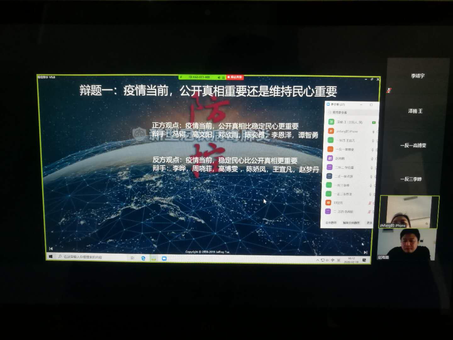 2020年2月18日上午10点,永利集团304am登录18级明德班利用Zoom平台,举办了“反思疫情,明德先行”线上辩论赛。围绕“新型冠状病毒的出现是好事还是坏事”和“公开疫情真相重要还是维持民心重要”两个论题展开激烈辩论。永利集团304am登录副院长赵海鹏、学院拔尖人才培养和国际交流办公室主任李志芳、2018级辅导员李靖宇担任比赛评委,王泽楠同学主持辩论会。