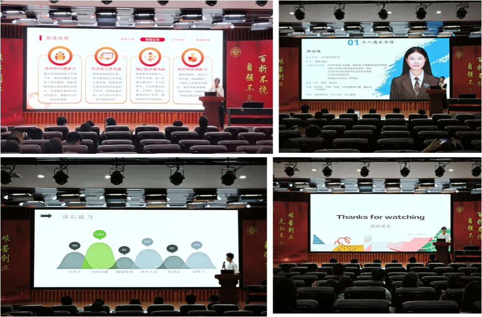 此次换届大会分为个人演讲和现场答辩两个环节,各部门成员踊跃参与、积极准备。竞选者依次上台发言,从自我介绍、职位认知、竞选优势、工作展望等多个方面进行汇报,总结过去一年的工作成绩,展望竞选后的工作计划。各位评委根据竞选同学的工作与学习情况,设置特定情景进行提问,结合实际对大家的情况提出建议。竞选者自信从容、沉着应答,充分展现了学院学生昂扬向上的精神风貌。此次学生组织负责人选拔秉承“民主、公平、公正”,以“部门服务学院、学校”的宗旨为原则,评委结合候选人的平时表现、工作态度、职位理解等等进行综合评估,最终确定新一届学生组织主要成员。