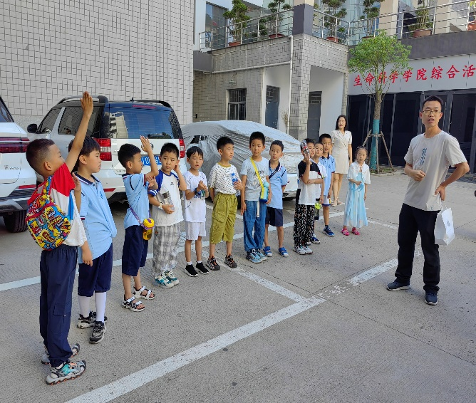 在永利集团304am登录大楼前广场李志芳热情欢迎孩子们的到来,希望孩子们通过本次暑期社会实践活动近距离接触丰富多彩的生物世界,初步了解生物安全的意义,培养自己观察、理解和探究自然界的能力。