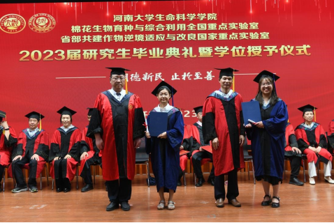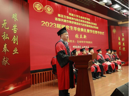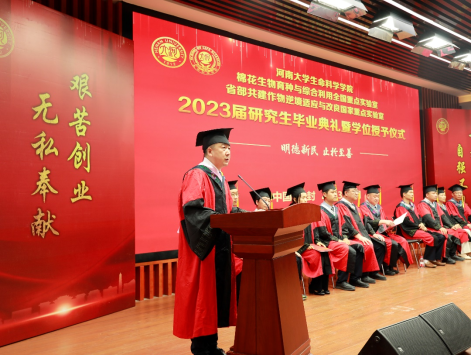 毕业生代表、2020级生物学专业研究生唐静代表全体2023届研究生毕业生发言,向学校、学院以及老师们表达了感激之情,回顾了在河大求学期间的学习和成长经历,感恩导师们在学术技能和人生奋斗目标方面的悉心指导和引领,她表示所有毕业生们会继续追求卓越,在未来的职业生涯中保持研究精神和求知欲望,不断学习和成长,勇于承担社会责任,为国家发展做出贡献。