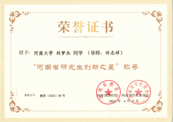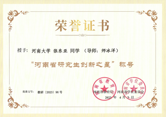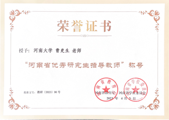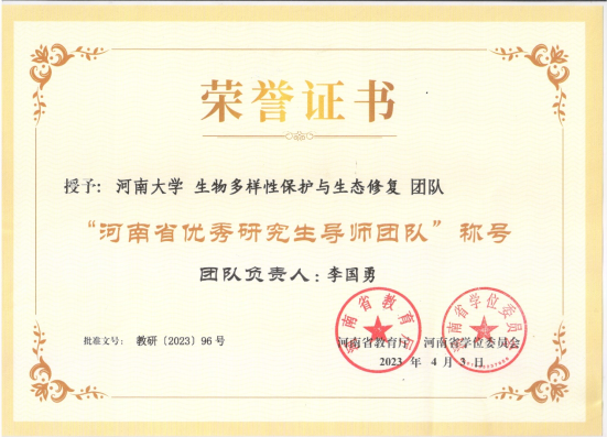 由李国勇教授担任团队负责人的永利集团304am登录“生物多样性保护与生态修复”团队荣获“河南省优秀研究生导师团队”称号;曹更生教授荣获“河南省优秀研究生指导教师”称号;2019级生物学专业博士研究生张东亚(导师:师冰洋)和2020级生物学专业硕士研究生刘梦杰(导师:许志祥)分别荣获“河南省研究生创新之星”荣誉称号。