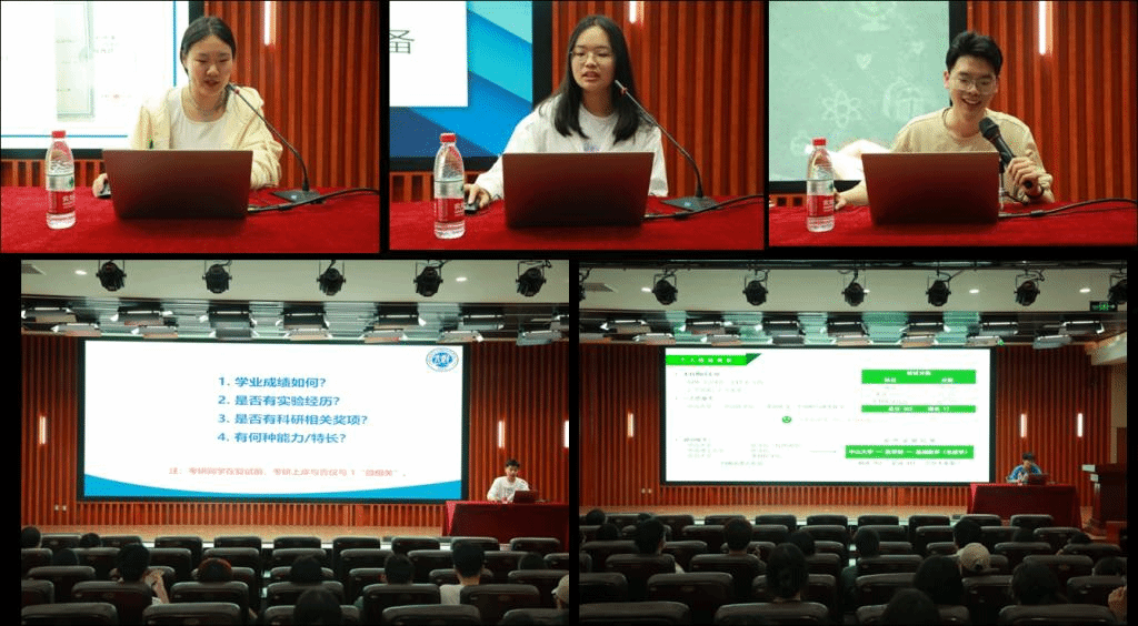 随后,余可儿和胡晓杰两位保研成功的同学从院校选择、夏令营投递、预推免等流程展开介绍,提醒同学们一定要戒骄戒躁,养成自我学习和潜心钻研的精神。何震宇、丁柏云等三位考研的同学就学习环境、心态调整、学习方法等方面进行了详细的阐述。他们建议同学们要找准自己的定位,根据自己实际情况制定复习计划,并要持之以恒的不断努力学习。