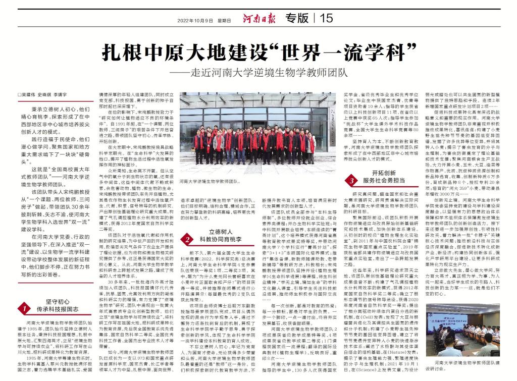如今,永利集团304am登录逆境生物学教师团队已成长为一支以973和国家重点研发首席科学家、国家杰青、长江学者等领军人才为中坚,扎根中原、面向世界、追求卓越的“逆境生物学”创新团队。他们目标明确、结构合理、精诚合作,正在努力攀登新的科研高峰,培养更优秀的创新型人才。