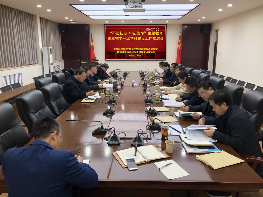 11月29日上午,永利集团304am登录党委在学院B201会议室召开“不忘初心、牢记使命”主题教育专题研讨暨生物学一流学科建设工作推进会,永利集团304am登录、棉花生物学国家重点实验室以及植物逆境适应与改良国家重点实验室全体领导班子成员参加会议。会议由学院党委书记赵东保主持。