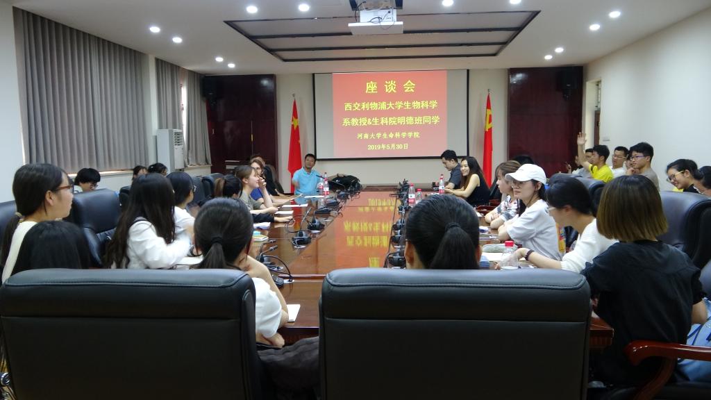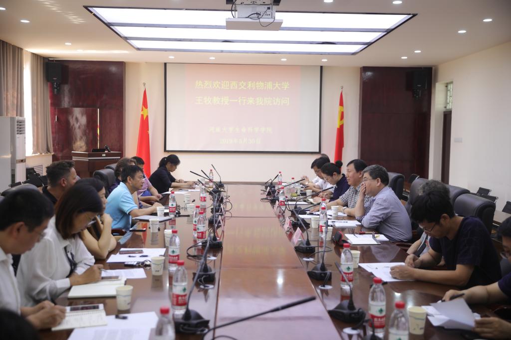 常务副院长苗雨晨代表学院对王牧教授一行的到来表示热烈欢迎,他介绍了学院的发展历程和“双一流”学科建设进展,客观分析了当前面临的机遇与挑战。苗雨晨表示,我院秉承开放创新的理念,以发展为导向,重视本科教学和拔尖创新人才培养,构建高效科研平台,以期提升科研能力,扩大学科影响力。西交利物浦大学凭借高水准人才培养质量和浓厚国际化特色,被誉为“中外合作大学的标杆”和“中国高等教育改革的探路者”。西交利物浦大学生物科学系拥有丰富的外教师资并与我院专业对接性强,在生物医学、农业和环境领域均可以开展多层面合作,尤其是在国际化育人方面双方具有较大的合作潜力,可共同培养知识、能力与素养兼备的具有国际视野和全球竞争力的优秀人才。