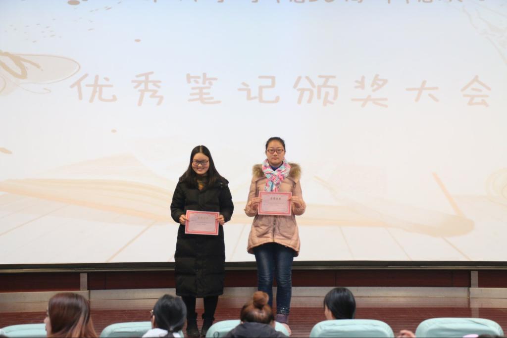 颁奖典礼分为两部分,优秀笔记展示和颁奖仪式。本次优秀笔记评选活动通过前期线上线下评比,评选出一等奖两名,二等奖四名,三等奖六名,优秀奖八名,最具人气奖一名。在优秀笔记展示环节,通过PPT的形式把获奖同学的笔记展示给现场观众。字迹工整,思路清晰的笔记映射出同学们良好的学习习惯,为大家做出了典型示范,营造出一种良好的学习氛围。