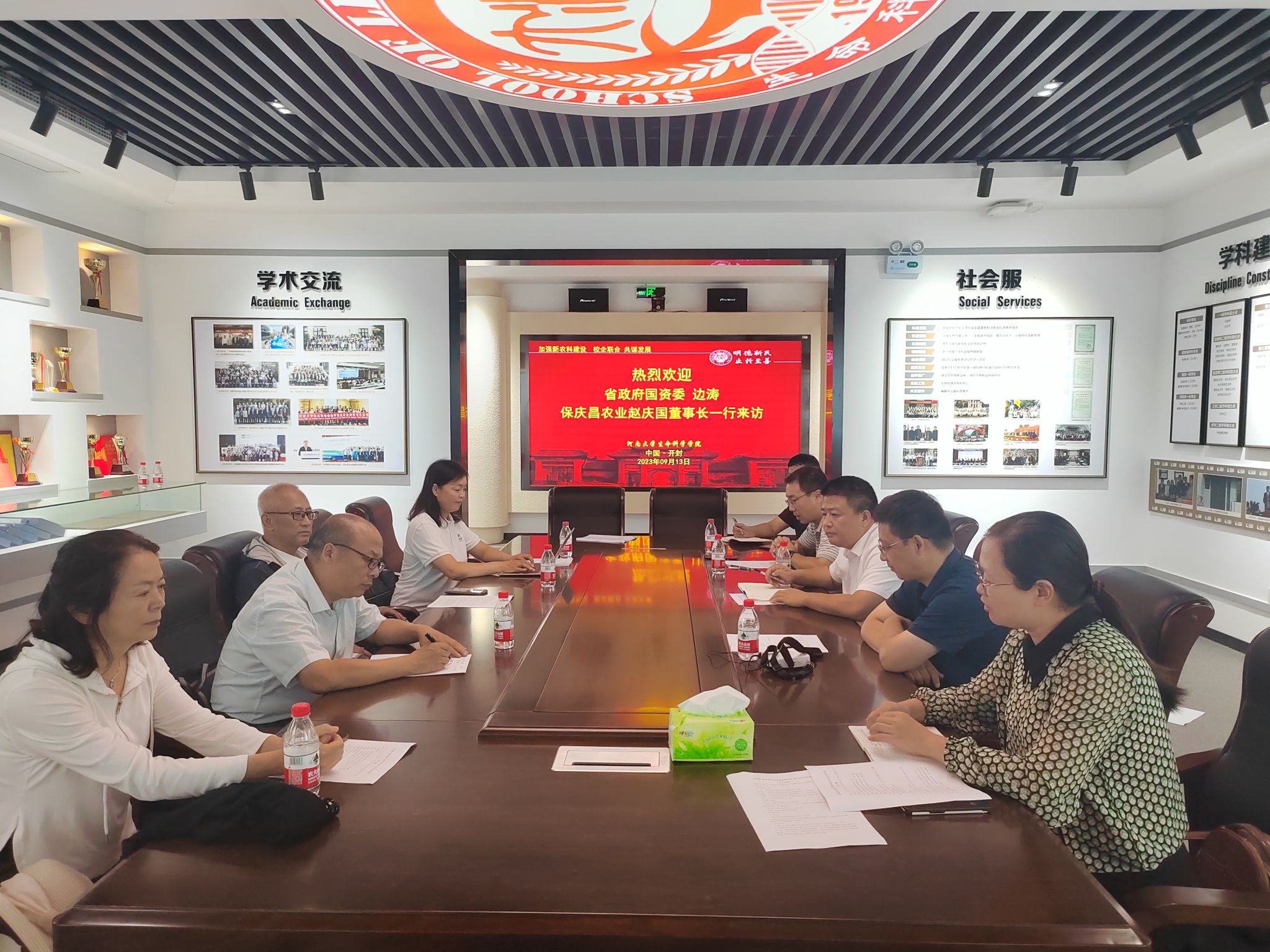 赵海鹏介绍了学院的基本情况和一流学科相关建设成就。他表示,学院积极学习贯彻习近平总书记给全国涉农高校书记校长和专家代表重要回信精神,主动履行社会服务职责,发挥专业优势服务地方经济;贯彻新农科建设理念,加强与地方政府和涉农企事业单位的合作,培养好农科人才,并以此为媒介促进了解,共同发展,从农业生产一线找题目研究并将成果回馈应用于生产实践,将论文写在祖国大地,在实践中提升人才培养尤其农科人才培养质量。边涛感谢我院的热情接待,介绍了河南省孟楼村的村情、“驻村书记”的职责和使命,希望我院发挥人才和科研优势,助力孟楼村的乡村振兴和保庆昌农业发展有限责任公司的发展壮大。周海燕代表公司介绍了目前的产业经营现状和面临的挑战,欢迎学院师生前往考察参观、开展实习和劳动教育,同时希望在技术方面得到学院的帮助和支持。