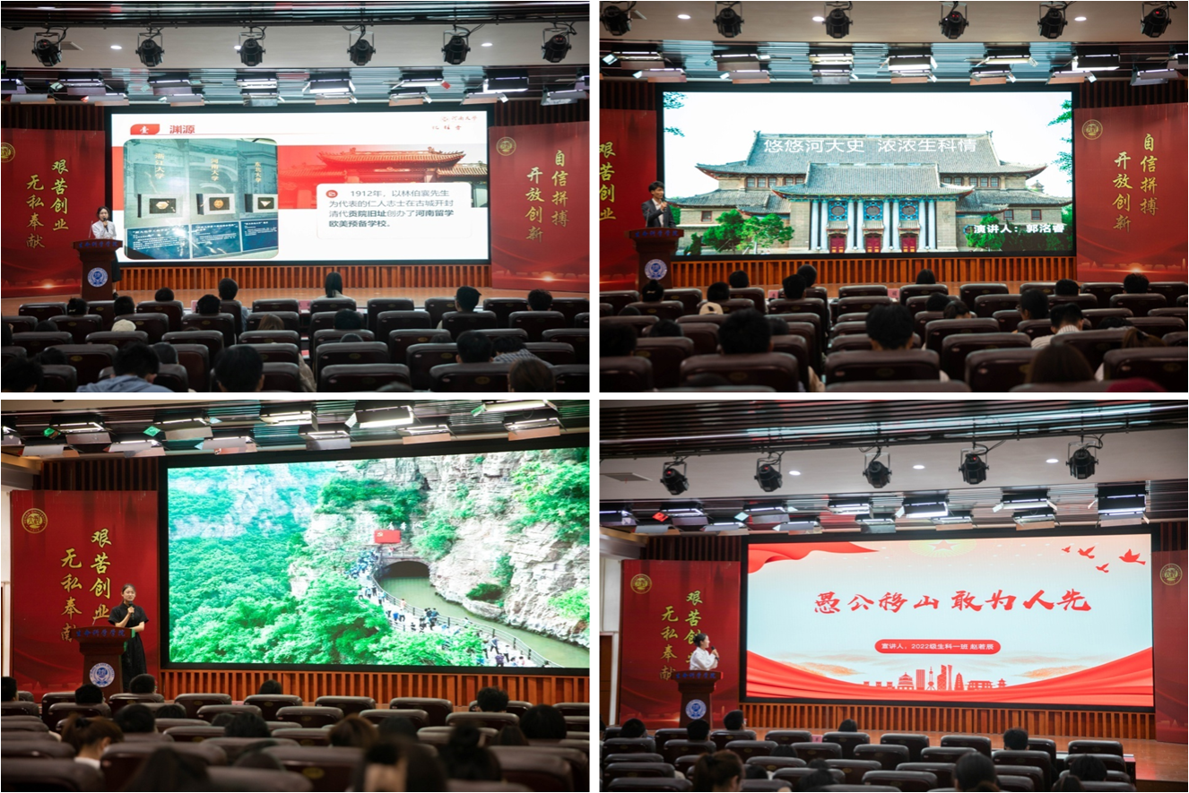 在宣讲家乡精神和文化中,谢岷珊分享了安阳红旗渠“自力更生、艰苦创业、团结协作、无私奉献”精神的传承与发展;赵若辰向大家讲述了家乡济源的愚公移山精神,愚公故里在新时代新征程中不断焕发新的生机和活力;王曦炀以真实的图片、朴实的语言分享着令人感动的四川抗震救灾事迹,展现“万众一心,众志成城”的伟大抗震救灾精神。一幅幅历史照片、一段段文字描述,让在场师生沉浸其中,纷纷表示新时代青年要强化政治品格,厚植爱国主义情怀,把红色资源利用好、把红色传统发扬好、把红色基因传承好。
