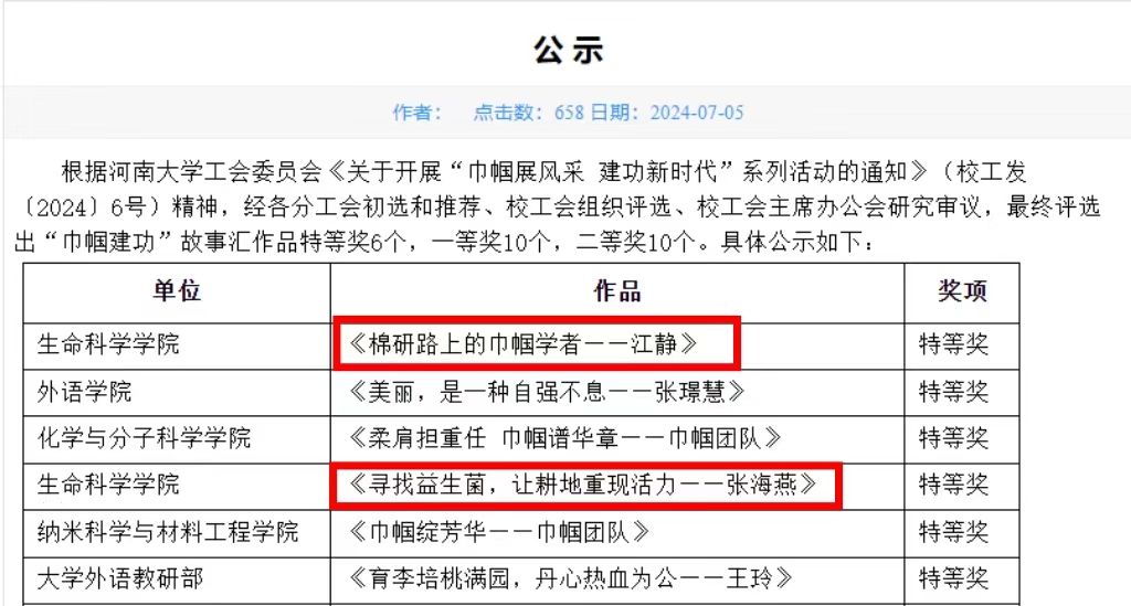 新时代呼唤新女性,新女性展现新作为。经各分工会初选和推荐、校工会组织评选、校工会主席办公会研究审议,近日公布评选结果,其中永利集团304am登录江静老师的作品《棉研路上的巾帼学者——江静》与张海燕老师的作品《寻找益生菌,让耕地重现活力——张海燕》荣获“巾帼建功”故事汇作品特等奖。此次入选展现了永利集团304am登录女教职工在教书育人、科研创新等方面开拓创新、甘于奉献、团结互助的优良师风、骄人业绩与榜样示范,展示她们在学校建设发展中的巾帼智慧和巾帼力量。