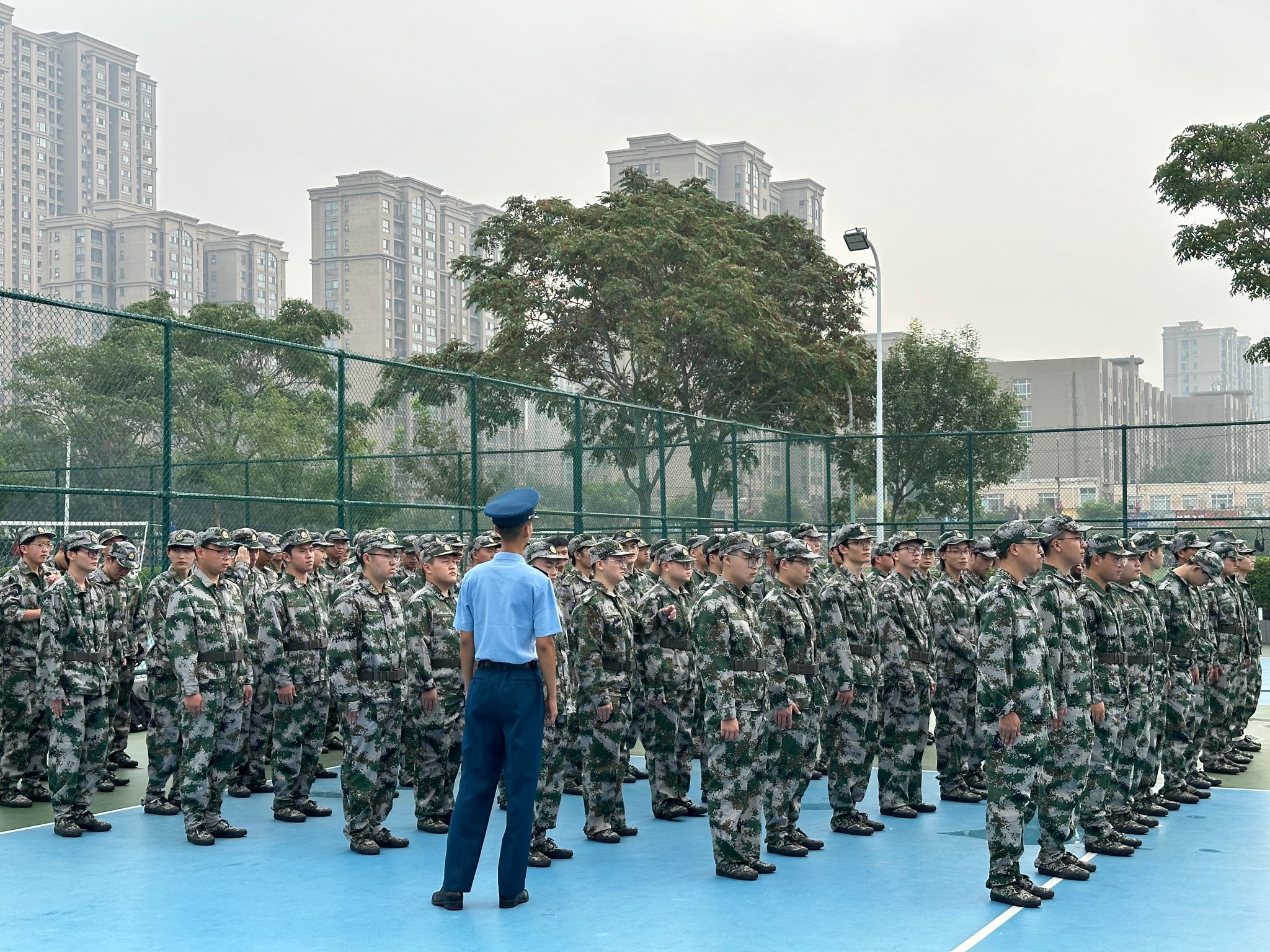 王刚代表学院对参训教官的辛勤付出表示感谢,对一直坚守在工作岗位的2022级辅导员李靖宇老师和参加本次军训的220名学生表示亲切的慰问。他讲到,军训是学校人才培养的必修科目,是增强学生国家安全意识和国防意识、强化学生集体荣誉、家国情怀和社会责任感的重要举措,并希望同学们通过14天的军训课程,弘扬爱国精神、锤炼过硬本领,发扬不怕累、不怕苦的精神,展现河大生科学子的卓越风采,以饱满的姿态交出满意的军训答卷。同时,叮嘱同学们在军训期间保障良好的身体状态,面对炎热的天气、高强顿的训练注意休息。