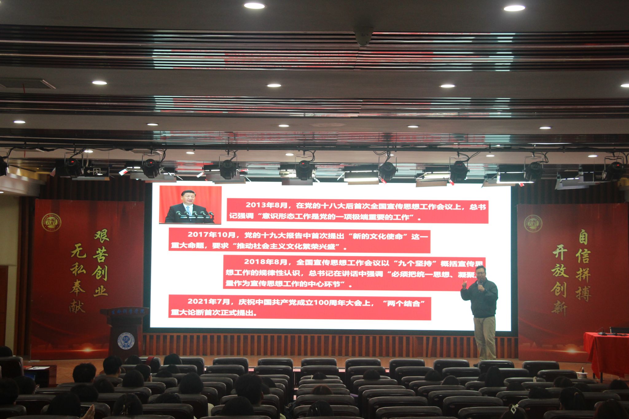 刘嘉尧系统讲述了如何学习贯彻习近平文化思想,铸就社会主义文化新辉煌。他结合自身经历和案例分析,以通俗易懂的方式深入解读了习近平文化思想,着重论述了全面建设文化强国的必要性和迫切性。他形象地将马克思主义比作“一颗种子”,应当种在中国的土地上、吸收中国的养分,更具有中国味、中国情。他强调,将我国从文化大国建设为文化强国任重而道远。文化事业与文化产业的协同发展,不断提升文化软实力以加强内涵式发展是必由之路。他呼吁各位同学,在满足个人文化需求的同时,还要深刻领悟中华文化的博大精深,了解我国需要掌握世界文化话语权的重要性与紧迫性,成为中华文化的传承者和传播者。最后,刘嘉尧鼓励大家自觉树立起高度的文化自信,积极践行社会主义核心价值观。