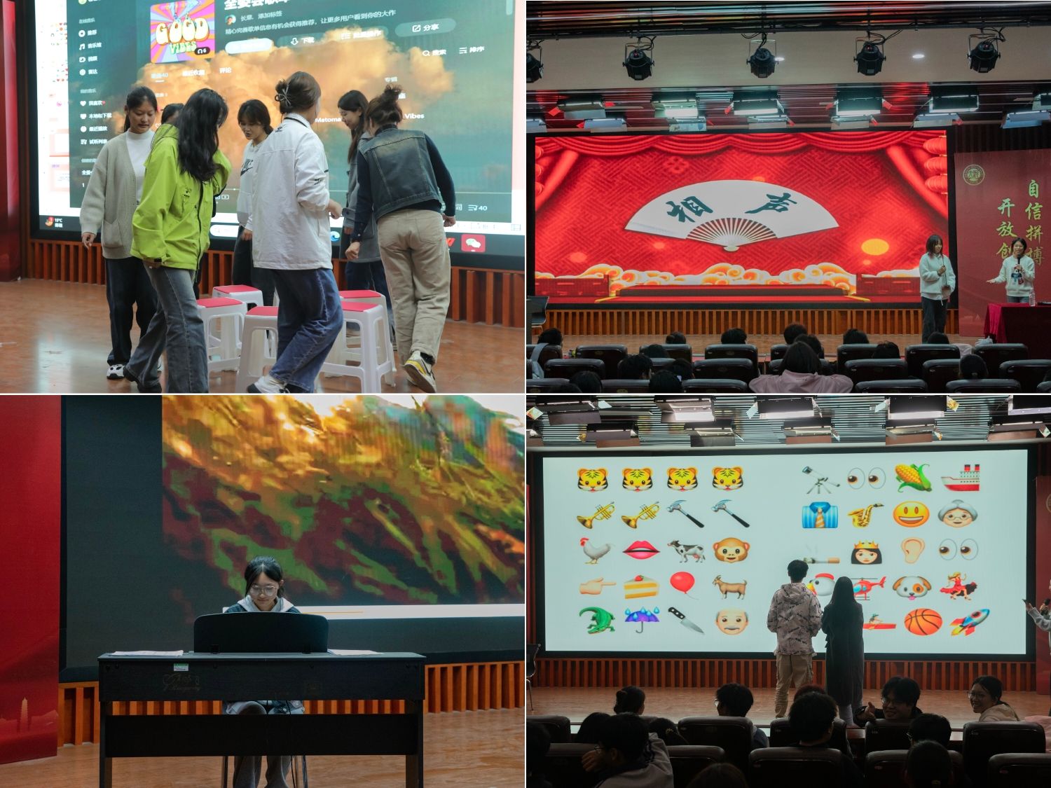 活动过程中,节目表演与互动游戏穿插进行,环环相扣,充分体现连贯性与趣味性。节目精彩纷呈,涵盖了相声、歌唱、乐器演奏等多元化的表演形式,其中合唱《在你的身边》默契十足、温暖人心,《想见你》深情动人、极具温柔,《梦中的婚礼》钢琴独奏则展现其精湛的技艺。随后实践部节目《青海摇 柯南摇》与外联部节目《东北爱情故事》东北摇更是将现场气氛推向高潮,赢得了观众的阵阵喝彩与掌声。此外,互动游戏环节同样精彩,“emoji猜成语”“抢凳子”“数字卧底”和“不能做挑战”等游戏不仅考验了参与者的反应速度,还锻炼了团队协作能力,每个人都沉浸在欢乐和谐之中。