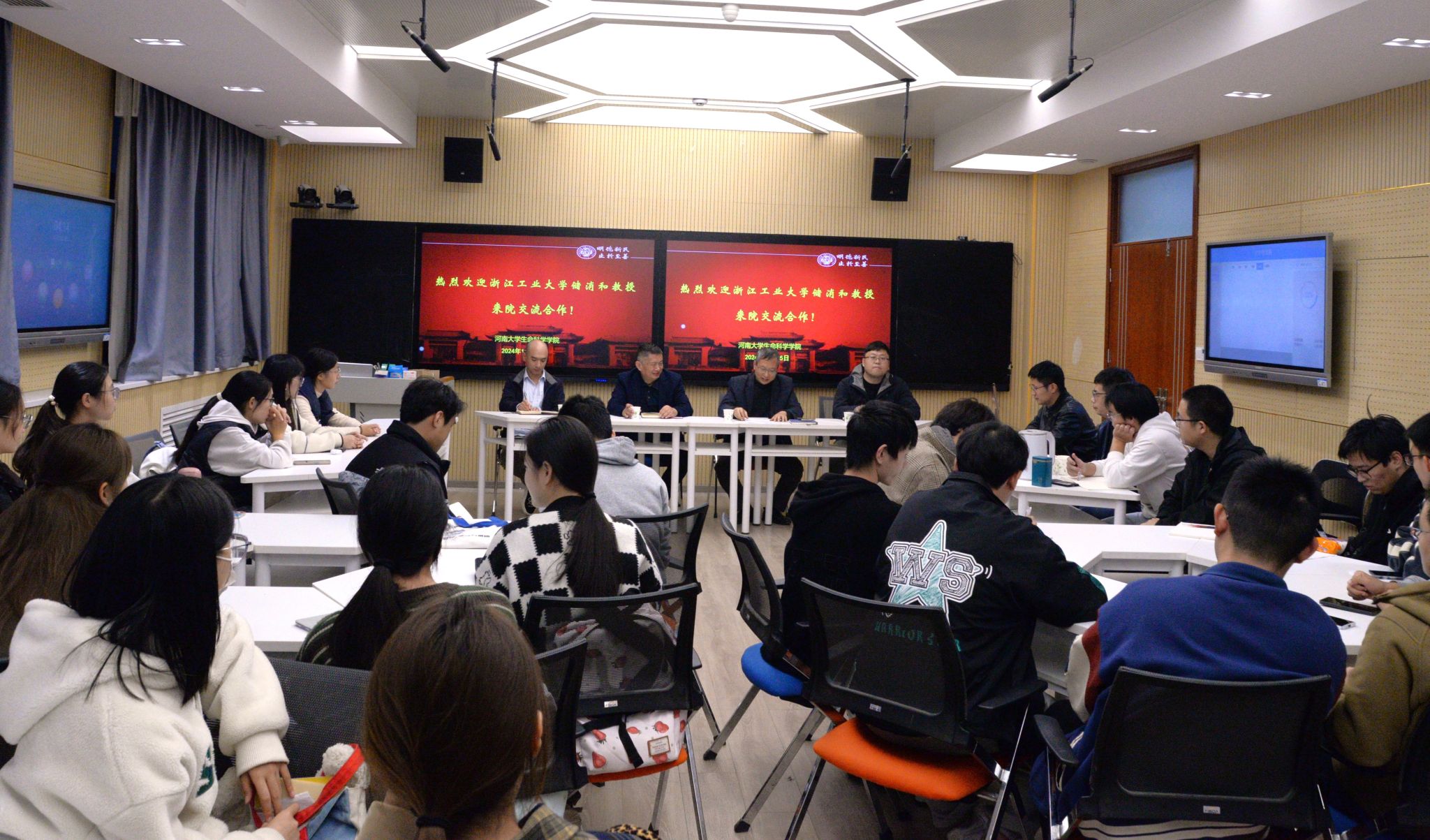 在交流互动环节,同学们围绕专业细分方向选择、生物行业需求热点、专业领域发展区位现状、课外实习推荐及出国深造等话题踊跃提问,储消和、靳魁奇耐心解答,为同学们提供建议和参考。