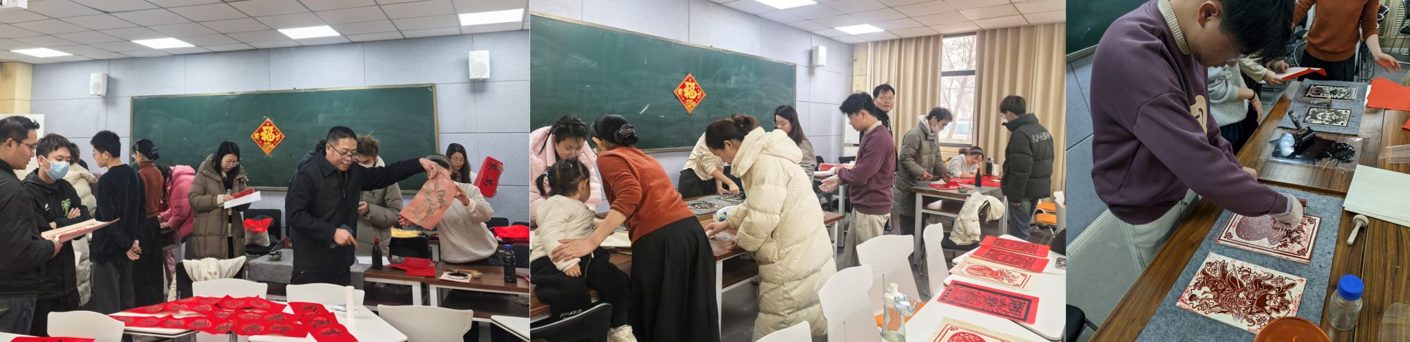 活动现场气氛热烈,翰墨飘香,年味十足。师生挥毫泼墨、交流切磋,行书、楷书、隶书等多种字体各显神韵,将美好的新春祝福倾注于笔端,创作出一幅幅带有“蛇”元素的福字与寓意吉祥、内容雅致的春联。“玉龙含珠辞旧岁,银蛇吐宝迎新春”“祥龙辞岁留瑞气,金蛇迎春启新程”……一行行俊逸的书法,一句句真诚的祝福,寄托着大家辞旧迎新、接福纳祥的美好愿望。同时,邀请美术学院连醒老师向师生详细介绍了传统木版年画的历史演变、艺术特色以及制作工艺,并指导大家亲自动手制作,从挑选木板、雕刻图案,到上色、拓印,每一个环节都凝聚着师生的专注与对传统艺术的赞叹。