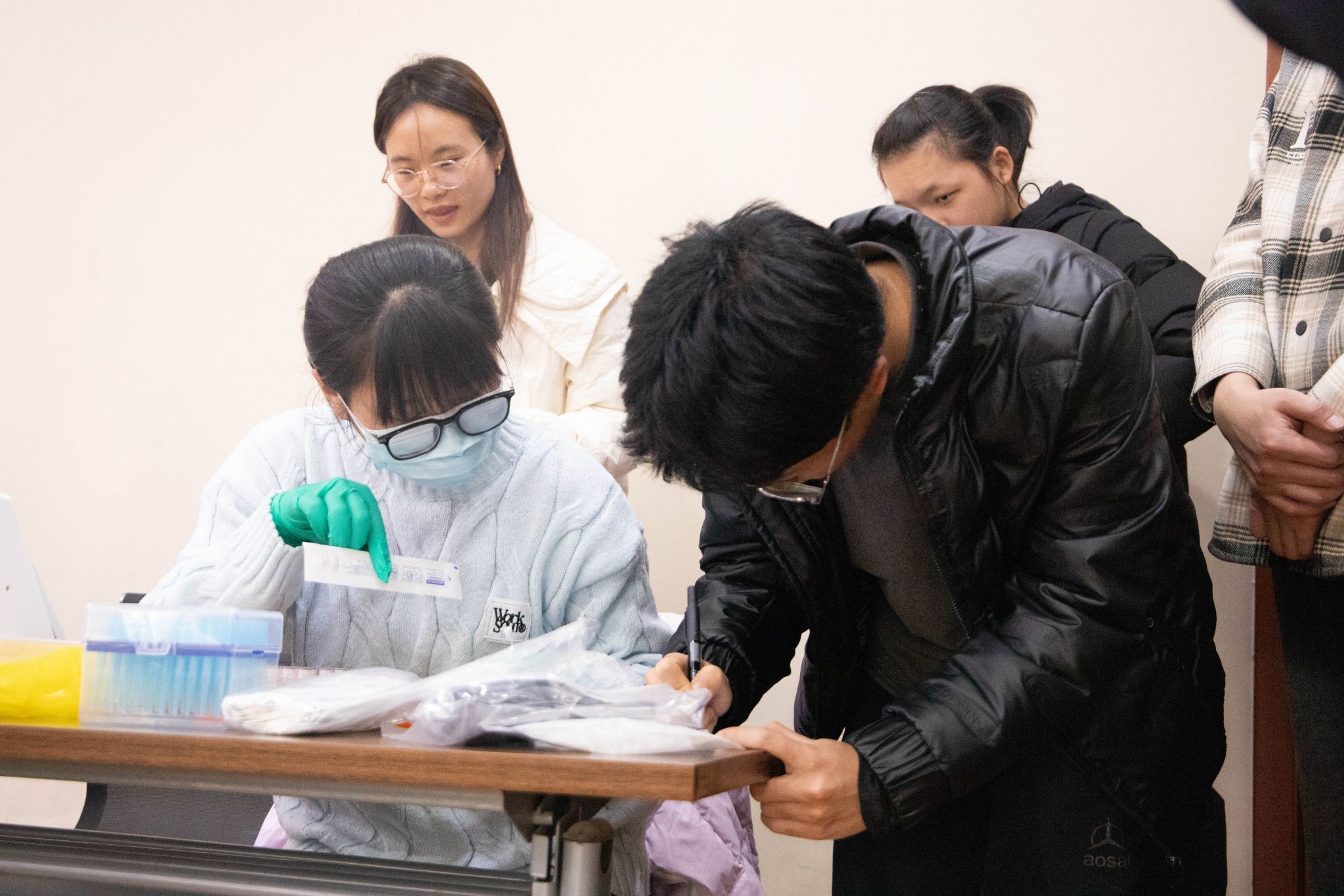 为了展示个人创业成果,郭强向师生现场展示了ALDH2基因即时检测技术,并组织师生参与现场检测。活动现场,师生们积极参与采样,气氛十分活跃。