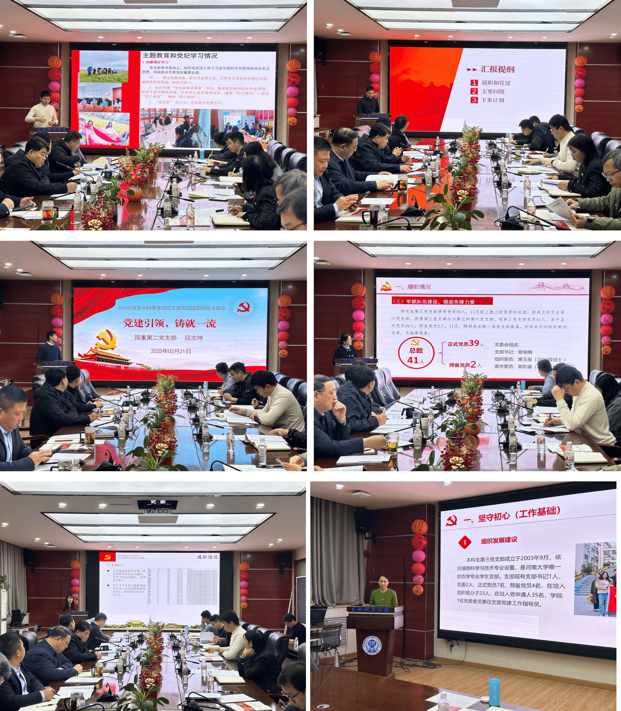 会议采取“一述一议”的方式进行逐一点评,充分肯定了2024年度各党支部深入开展主题教育、党支部标准化建设和支部特色等方面取得显著成效。会议指出,各支部要结合专业特色,扎实开展“一支部一特色”品牌建设。教工党支部要充分发挥“双带头人”作用,促进党建和业务深度融合;学生党支部要进一步激发学生活力,创新党建发展模式,充分发挥党员的先锋模范带头作用,营造良好的科研和学习氛围。