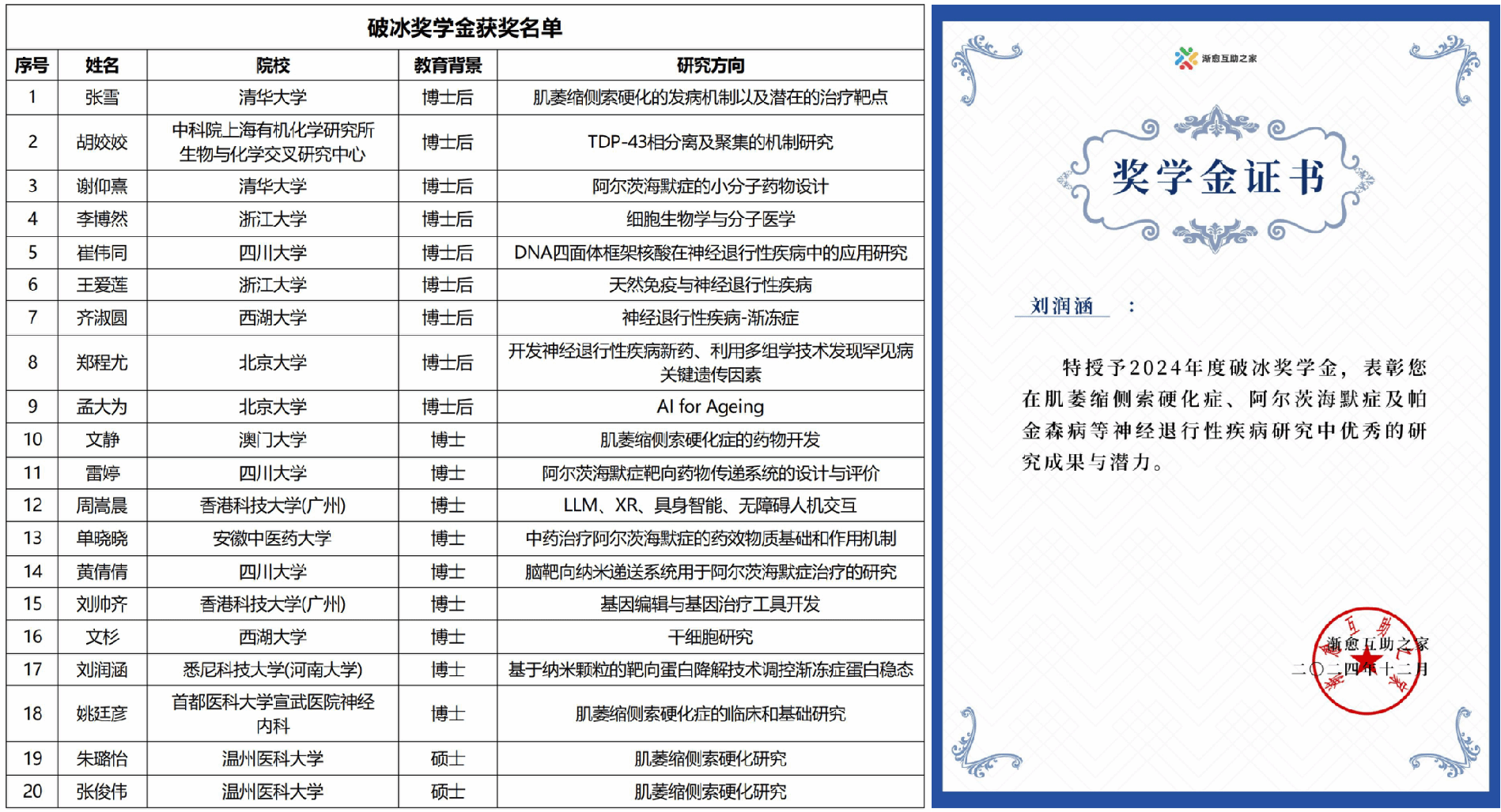 破冰奖学金由著名公益人士和企业家蔡磊先生团队设立,旨在支持有潜力的青年科学家突破科研瓶颈,在神经退行性疾病领域取得创新性成果,鼓励更多科研人才投身于肌萎缩侧索硬化症(ALS)、阿尔茨海默症、帕金森病等神经退行性疾病领域研究,在相关领域中具有较大影响。