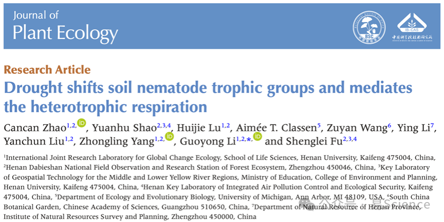 Cancan Zhao, Yuanhu Shao, Huijie Lu, Aimée T. Classen, Zuyan Wang, Ying Li, Yanchun Liu, Zhongling Yang, Guoyong Li, Shenglei Fu, Drought shifts soil nematode trophic groups and mediates the heterotrophic respiration, Journal of Plant Ecology, 2024, 17, 2, rtae012, https://doi.org/10.1093/jpe/rtae012