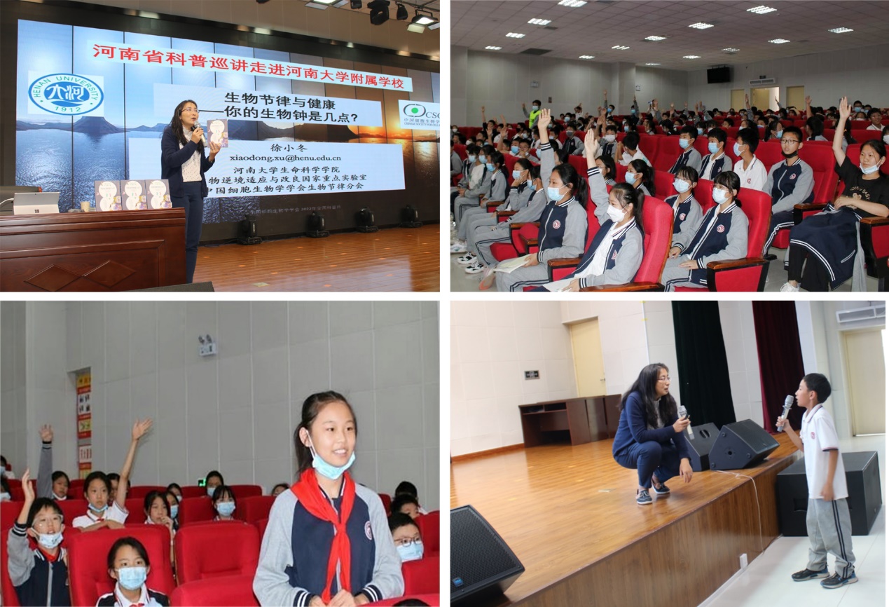 金秋送爽、丹桂飘香。为响应中国科协、中国细胞生物学学会等18部门“喜迎二十大,科普向未来”的号召,在全社会营造爱党爱国、热爱科学、崇尚创新的良好氛围,激发青少年的创新创造潜能,我院师生于9月23日赴郑东新区永利集团304am登录附属学校为中小学生开展“生物节律与健康”主题科普活动。徐小冬教授带队,青年教师王来副教授、袁力博士、高凯博士,研究生代表陈梦真、陈天恩、岳淑敏参加了活动。