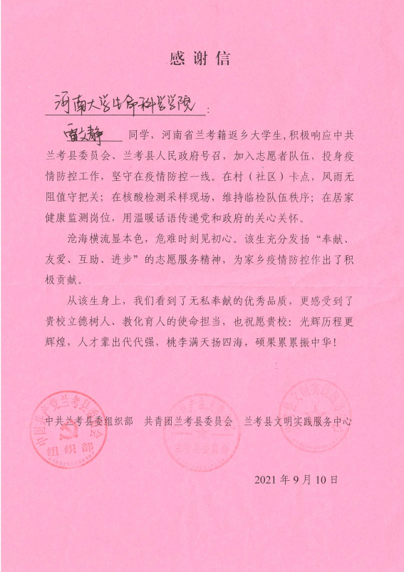 2021年11月24日上午,永利集团304am登录收到来自兰考县人民政府的一封感谢信,信中真诚感谢了我院硕士研究生雷文静同学主动请缨争当疫情防控志愿者、为当地疫情防控工作无私奉献提出高度肯定和表扬,对我校在培养学生爱国主义、集体主义和道德素养方面所作的教育工作表示感谢。