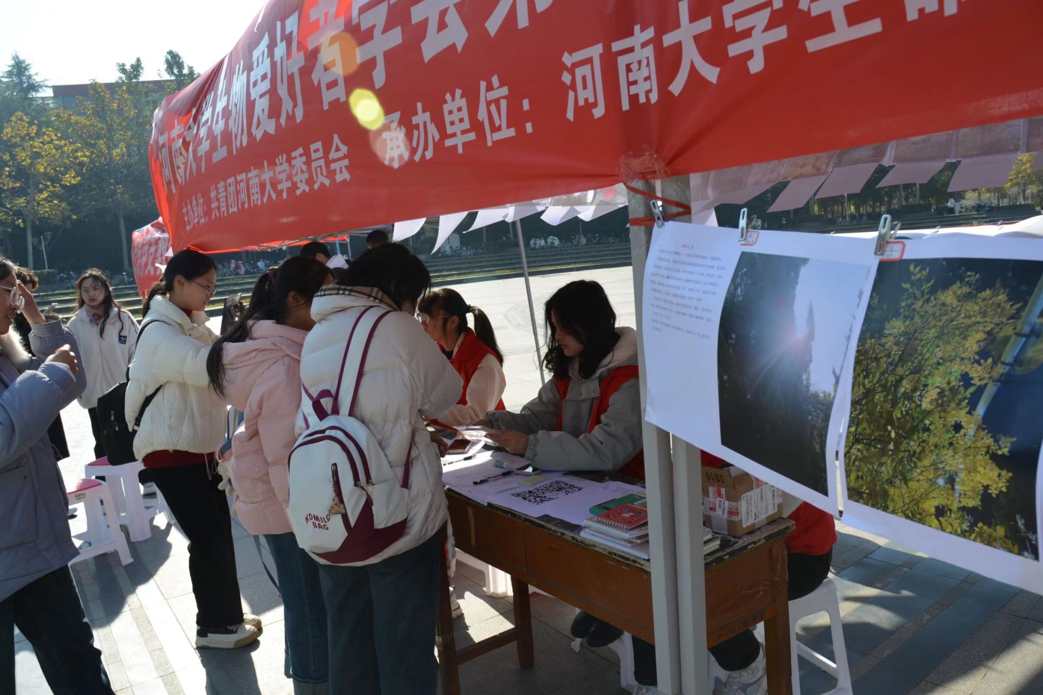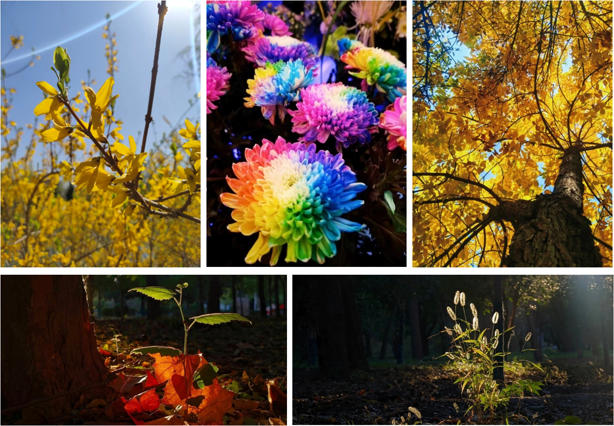 经征集以来,全校学生积极参与,来自14个学院近200名学生参加此次活动,共征集118幅优秀参赛作品。这些作品内容来源于校园植物、景区花卉和湖边风景等,一棵长在路边的野草、一抹枯树开出的绿芽,一朵绚丽多彩的菊花,镜头真切地记录了它们的美丽。活动展出现场,上百幅作品悬挂在马可广场进行展览,在阳光的照耀下,光与影的碰撞,带来了一场艺术视觉盛宴,吸引了众多在校师生驻足观赏。其中,《大自然的万花筒》作品前人气爆棚,参观者纷纷感到惊奇,不禁问到,“这个颜色的菊花,原来好像没有见到过,它怎么是彩色的呢?是后期染色的吗?”活动现场对彩色菊花背后的“秘密”展开了热烈的讨论,志愿者们就此问题也给予了专业的解答。