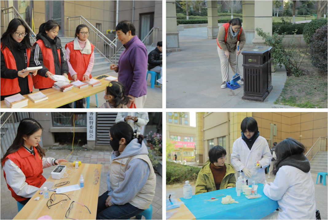 寒风习习,情暖人心。学院团委精心组织、积极谋划,组织学生来到开封市龙亭区金水社区,结合实际开展志愿服务活动,同学们用实际行动诠释了“纸上得来终觉浅,绝知此事要躬行”的深刻道理。本次社区实践活动包含社区治理、志愿科普、文体活动等内容,志愿者们使用手中的工具捡起散落的垃圾,将可回收物、有害垃圾和普通垃圾进行分类处理,完成了垃圾管理和废物回收,社区面貌焕然一新。提供医疗健康服务的志愿者们为前来参与检验血型、洗眼镜的社区居民热情服务,认真地向居民们科普正确的用眼方式,呼吁大家加强体育锻炼,健康生活。